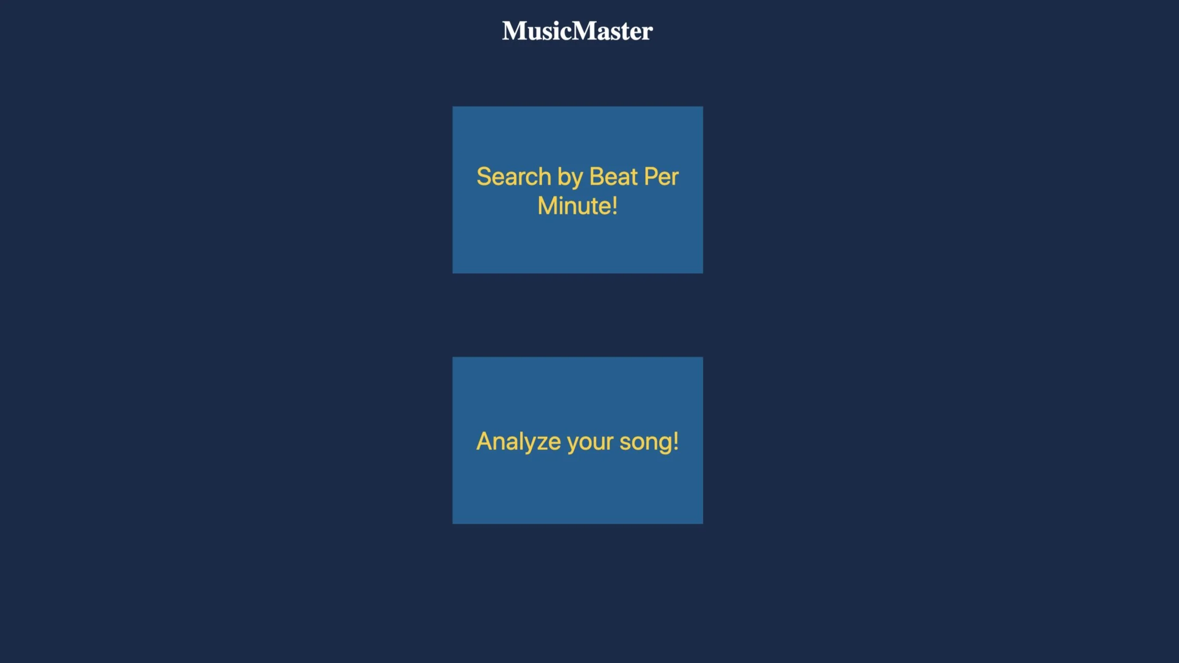 “MusicMaster” is a web application inspired by, and designed for DJs and music lovers to be able to find new, rhythmically similar songs to ones they already know! Aside from being able to search and listen to new songs, the user can also create a playlist of favorited songs they can save and later find. With the help of the Spotify API, MusicMaster is able to provide a selection of playable songs to the user given a simple BPM or Song Title query.
